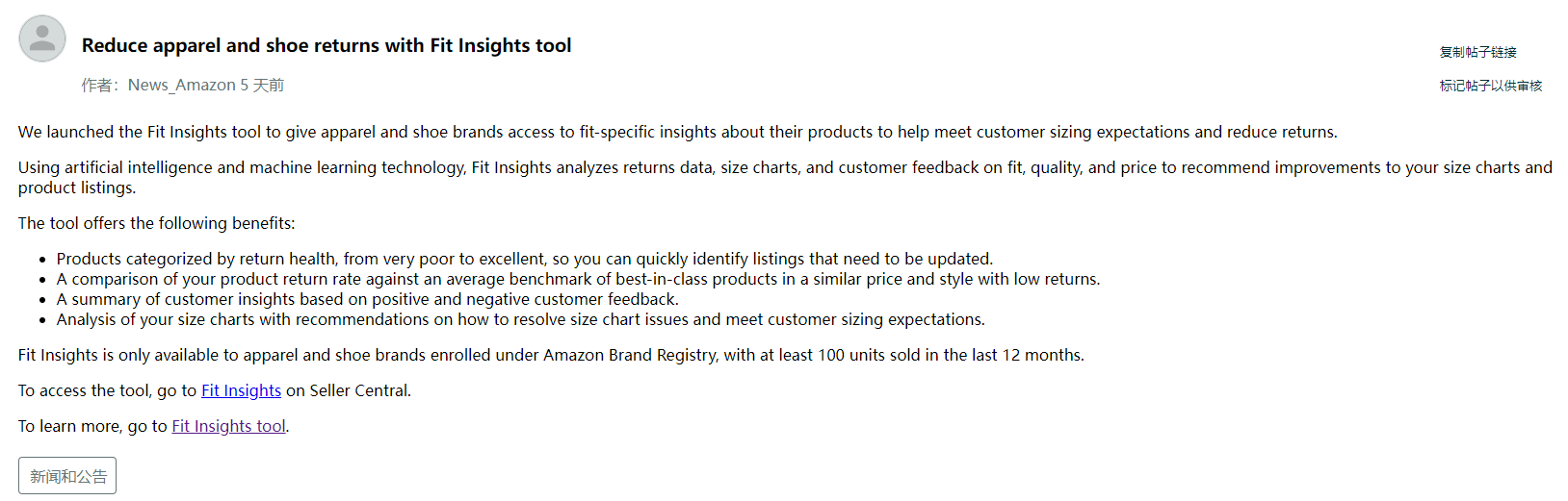 需要注意的是,F(xiàn)itInsights只適用于在亞馬遜品牌注冊的服裝和鞋類品牌,且過去12個月內最少售出100件。