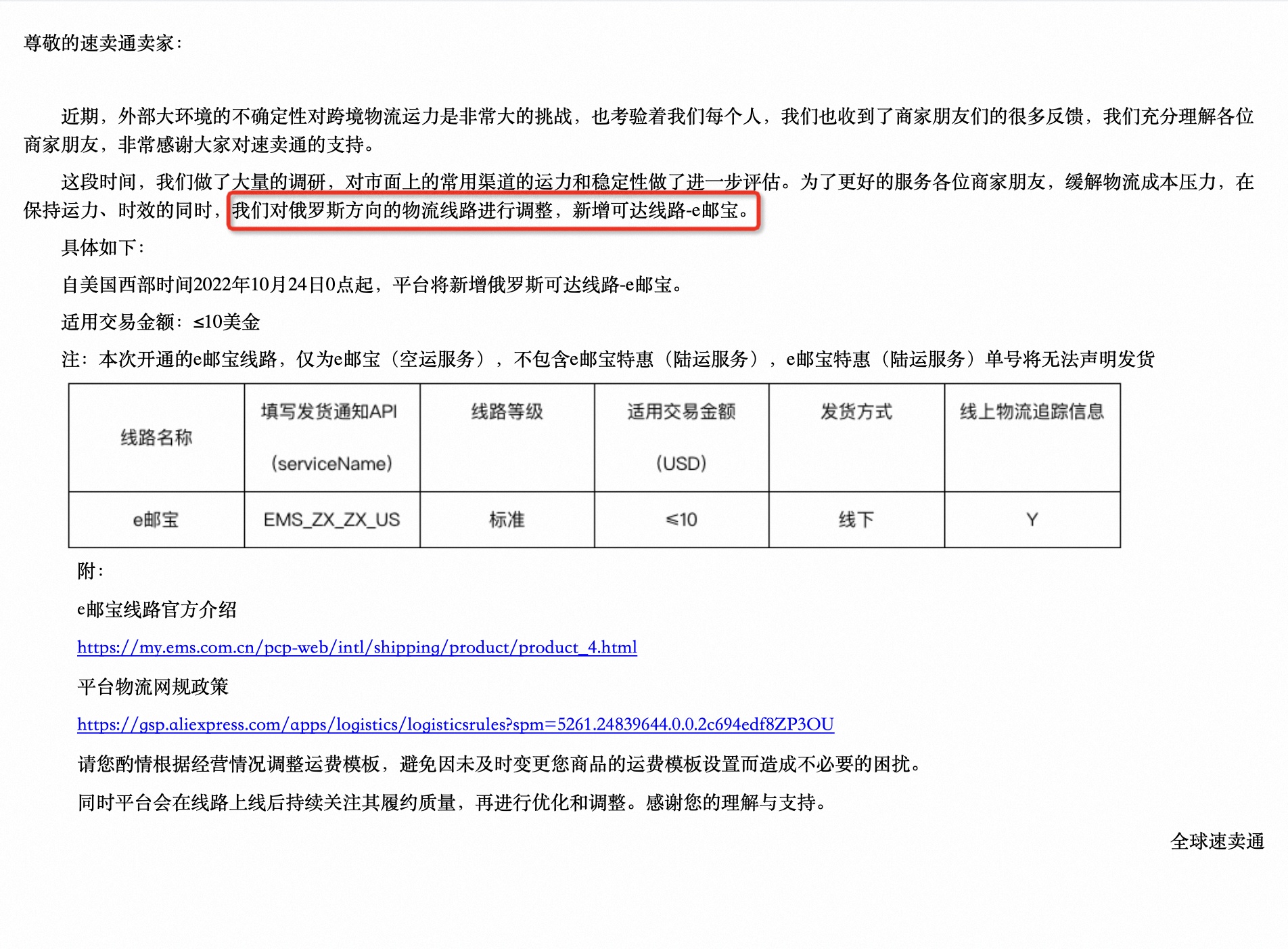 速賣通發(fā)布最新通知對(duì)俄羅斯方向的物流線路進(jìn)行調(diào)整。