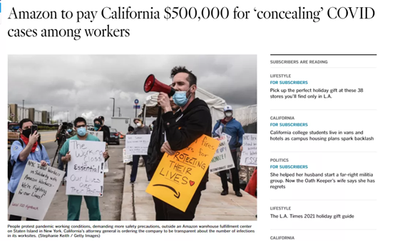 在此次判決當中,亞馬遜不但被開出了“疫情管控不利”罪名下最高的罰金50萬美金,更加是被規(guī)定一定要每一天將倉庫內的新冠感染狀況告知到其數萬名倉庫工人,并披露其工作場所的準確病例數。